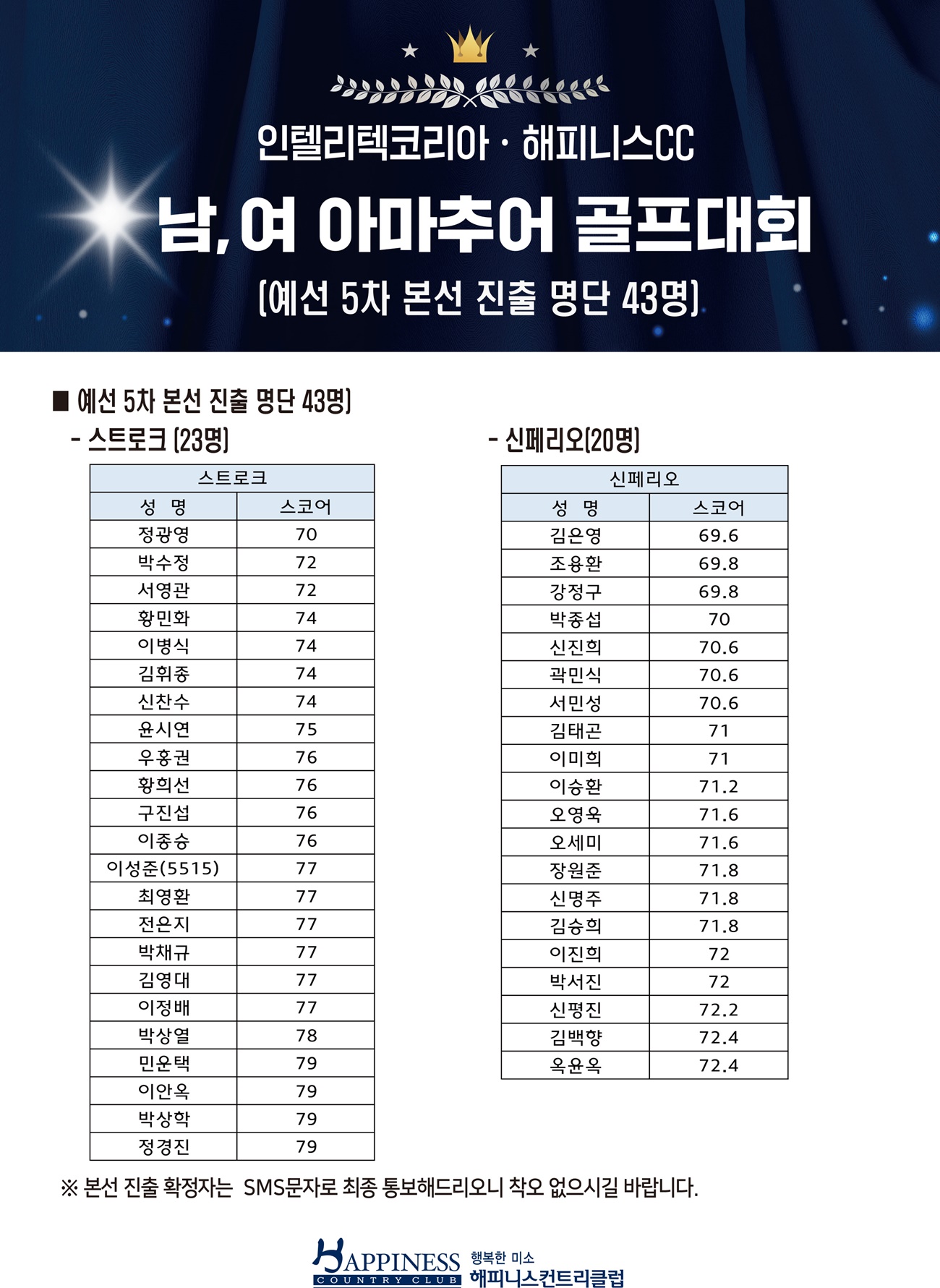 인텔리텍코리아,해피니스CC 남,여 아마추어 골프대회(예선 5차 본선 진출 명단)