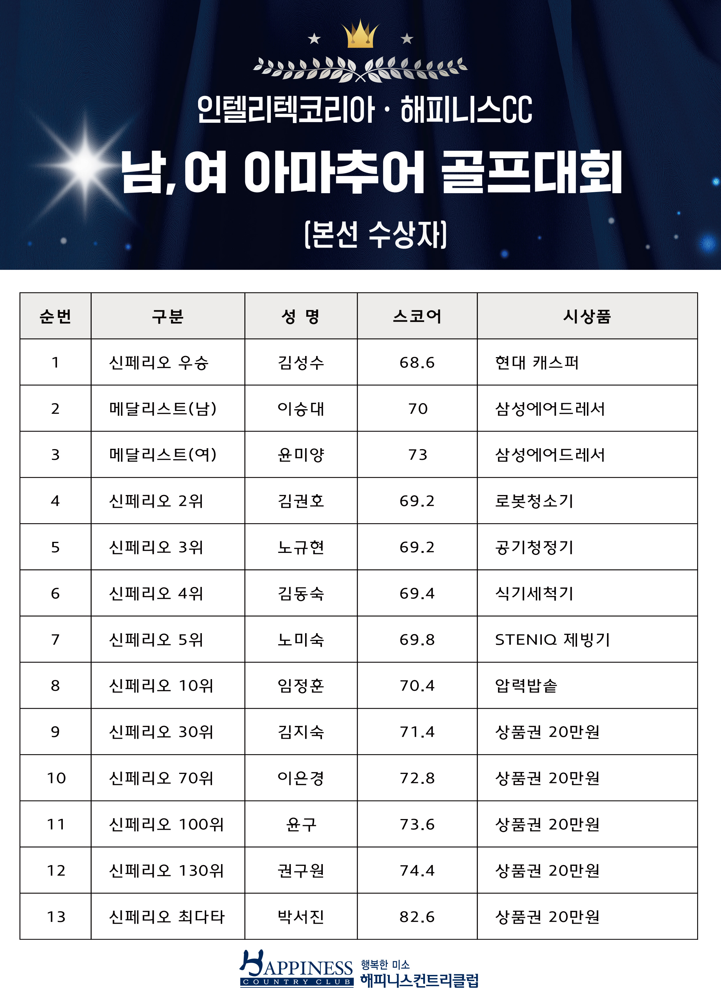 인텔리텍코리아,해피니스CC 남,여 아마추어 골프대회(본선수상내역)